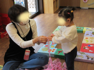 手作りおもちゃ「スズランテープでカーテン」 先日、スズランテープを裂いて作るかわいいカーテンを作りました。 2歳のお子さんはお母さんと一緒に手先を上手に使って楽しんでいました。 たくさん手を動かしてふわふわのカーテンが完成しました(*^-^*) 鈴が付いているので音や肌感触が刺激されてねんねのお子さんでも楽しめますよ♪ お部屋のコーナー作りにもお使いいただけます。 ご参加いただいたみなさま、ありがとうございました。