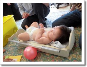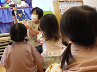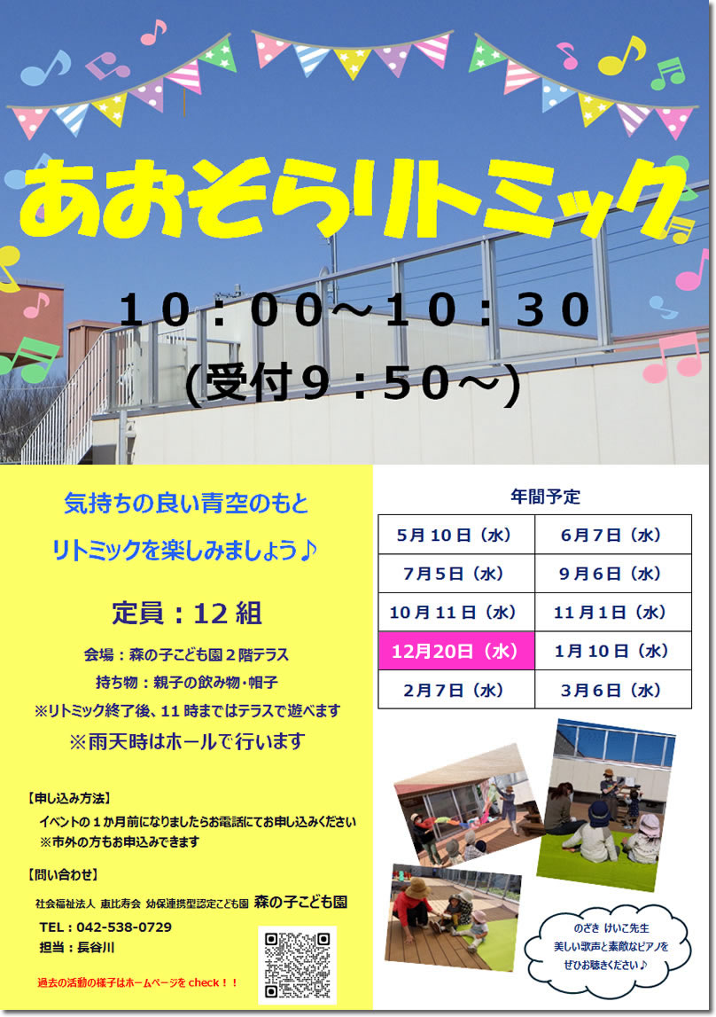 | 気持ちの良い秋空と言いたいところですが、 テラスはまだ夏を感じるほど汗ばむ陽気でした。 9月は残暑が厳しく、シフォン布を使って海に見立てた遊びをしました。 10月からは秋をキーワードにしたリトミックメニューが盛り沢山! 赤いシフォン布をトンボが飛ぶ夕焼けに見立て、揺らして遊んだり、 次回は12月20日(水) |