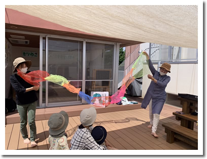 リトミックシフォンでは夕焼けや焚火を表現し、ゆらゆらゆれる布の動きや感触に大喜びでした